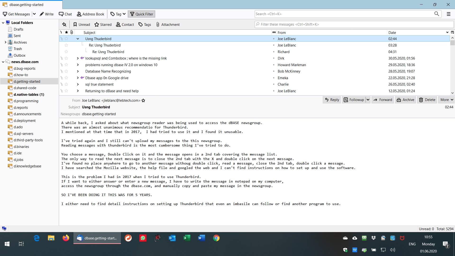 > A while back, I asked about what newsgroup reader was being used to access the dBASE newsgroup.