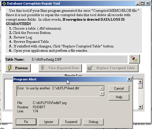 The program worked great to fix two errors which showed up in a database of about 43600 records. However, with dBASE10 there is an error message that shows up immediately after hitting the process button, which I have attached. I thought at first that this was because fixed.* is left in the dUFLP directory, but even when the three files are deleted, they reappear immediately when the program is run, and I get the same error message. Clicking on Ignore allows the program to continue to completion.