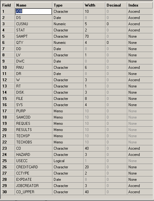 If I return to my table, which has about 45000 entries, and use modify structure, and just enter the JOB field and set it again to be indexed ascending, there is a delay of about 10 seconds while the mdx file is recreated, but when this is done, the Index column still shows "N" for JOB.