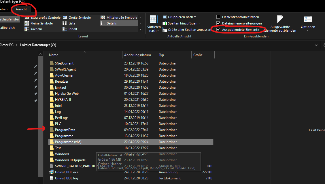 > Using the Windows Explorer I don't see C:\ProgramDATA\ect. or can't find that path. I see C:\ProgramFILES but not ProgramData. Maybe the old eyes are getting older ,or ?. Any clarifation. or explanation would be greatly appreciated.....Bob