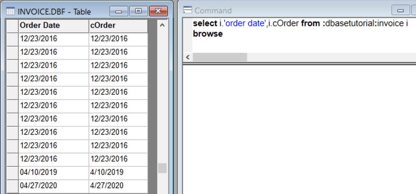 > select i.'order date',i.cOrder from :dbasetutorial:invoice i