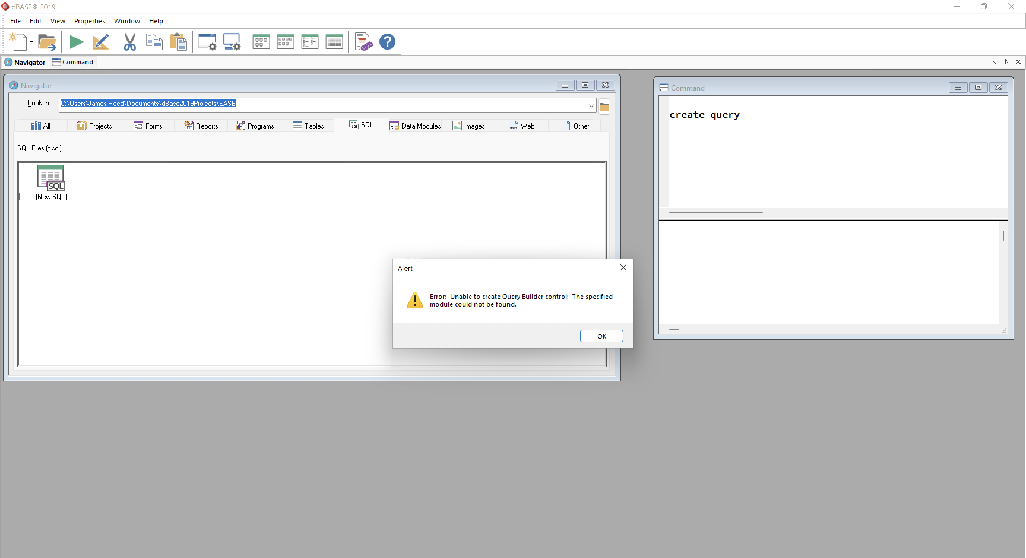 > I\\\'ve had to do a reinstall of dBase 2019. All is working well except one issue. When clicking New SQL an error pops up on the scree which says: